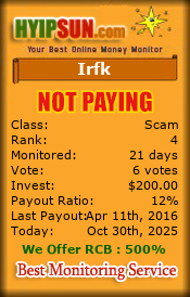 <a href="http://hyipsun.com/details/lid/165/" target="_blank"><img src="http://hyipsun.com/image/lid/165/" border="0" alt="Monitored by HYIPSUN.COM"></a>