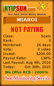 <a href="http://hyipsun.com/details/lid/186/" target="_blank"><img src="http://hyipsun.com/image/lid/186/" border="0" alt="Monitored by HYIPSUN.COM"></a>