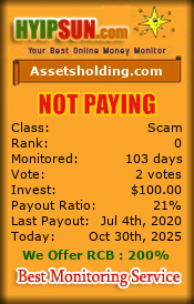<a href="http://hyipsun.com/details/lid/398/" target="_blank"><img src="http://hyipsun.com/image/lid/398/" border="0" alt="Monitored by HYIPSUN.COM"></a>
